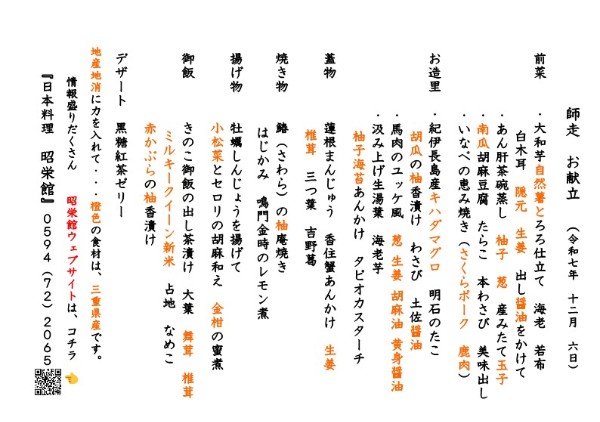 | 「雅 みやび」会席 | 5,500円 | 7品・・・四季会席(季節替わりのコース料理)です。 ご法事 各種お食事会に。 +3,300円で長寿のお祝いなど、 前菜に「鯛の姿焼き」を盛り込むことができます。 お一人様分から承ります。(お持ち帰りできます) +800円で 御飯ものを 「鯛茶漬け」に変更できます。全員の変更をお願いします 鯛茶漬けのイメージはコチラ。 +4,400円で 焼き物(献立により揚げ物)を 「飛騨牛ヒレステーキ」に変更できます。 飛騨牛ヒレ 約100グラムのご用意です。 最近のお肉の様子は、 昭栄館インスタグラム 等からご覧ください。 又は、 +4,400円で 「伊勢海老の鬼殻焼き(焼き伊勢海老)」に変更できます。 ステーキ 伊勢海老への変更は、 お一人様だけでも承ります。 |