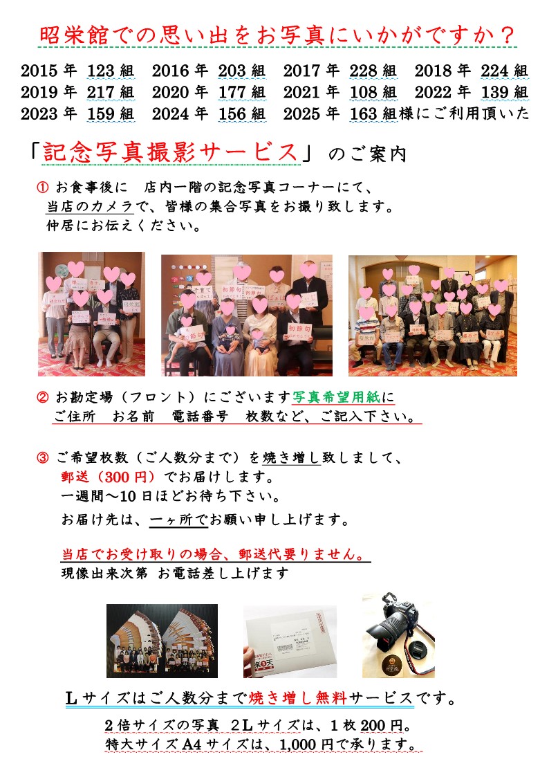 撮影 現像 焼き増し(ご来店のご人数分まで)無料サービスです