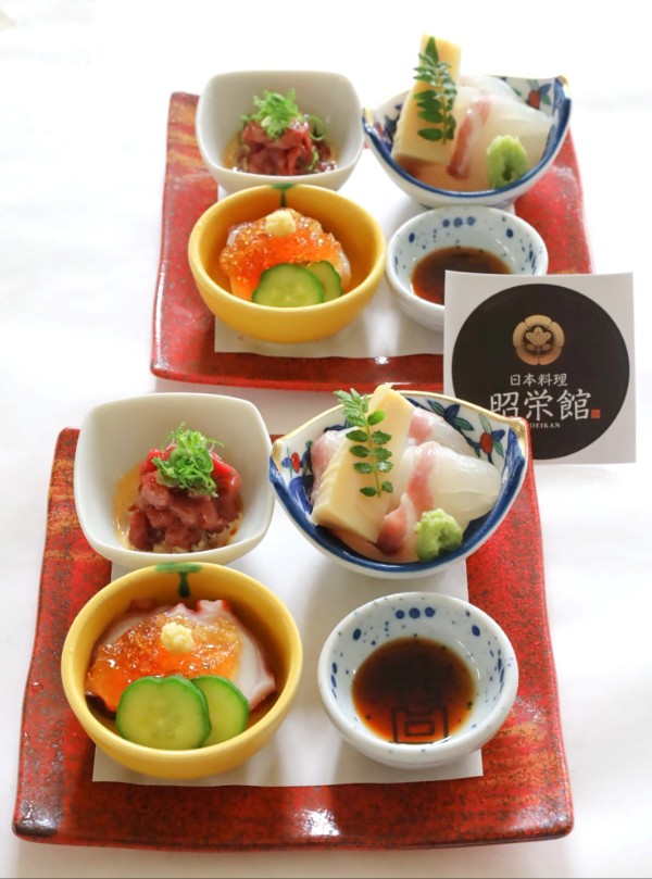 | 「てっさステーキ会席」 | 13,000円 | 8品・・・てっさ会席の焼き物が 「飛騨牛ヒレステーキ」に。 又は、 「伊勢海老の鬼殻焼き(焼き伊勢海老)」に。 ご予約の際に、申し付け下さいませ。 御飯物は、「昭栄館名物 鯛茶漬け」をご用意します。 12月~2月は、 出世魚(鰤 ぶり)の「鰤茶漬け」のご用意です。 食後にコーヒーをご用意します。 +3,300円で長寿のお祝いなど、 八寸に「鯛の姿焼き」を盛り込むことができます。 お一人様分から承ります。(お持ち帰りできます) |